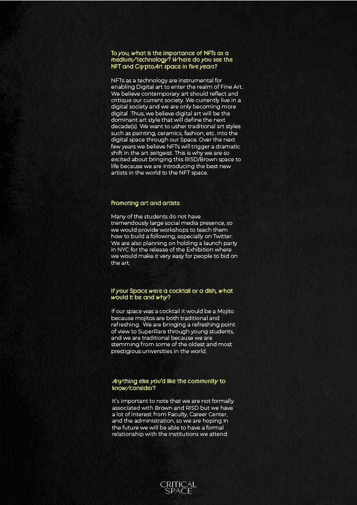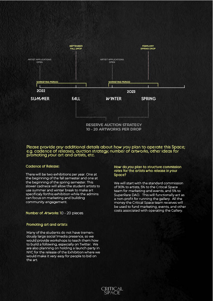 We are eager to present curations on a quarterly basis with supporting content and opportunities generated monthly – we envision our partnership to be a sliding scale of opportunities that range in capabilities. For example, we could host digitally native curations as easily as 1x per month and quarterly events with SuperRare that are more elevated and tailored to a physical / digital integration. Additionally, we would be eager to participate and partner with other spaces, curators and SuperRare hosted events to showcase our support of the partnership.