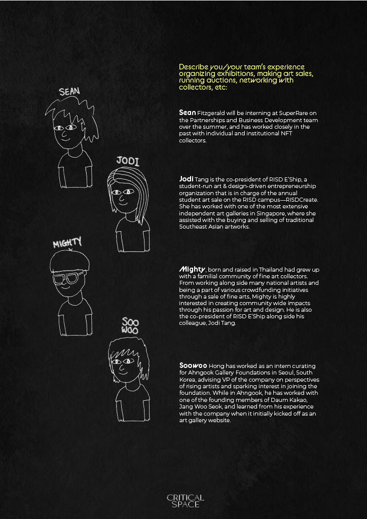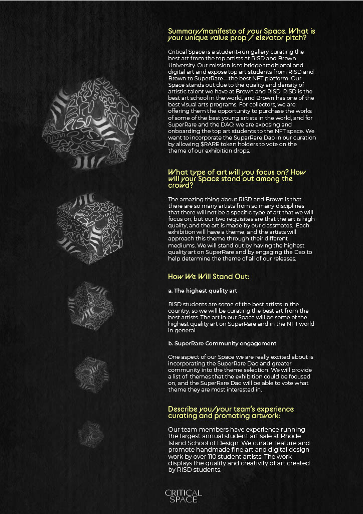 - Summary/manifesto of your Space (~500 words). What is your unique value prop / elevator pitch? What type of art will you focus on? How will your Space stand out among the crowd?